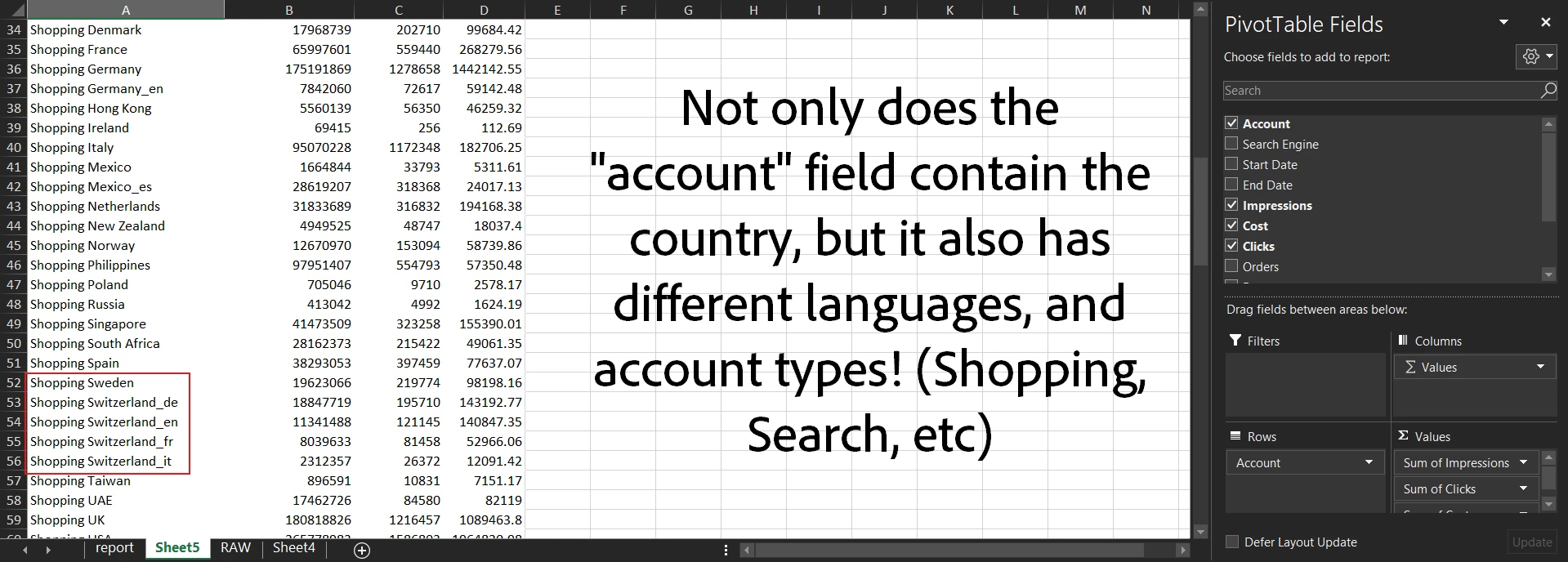 Cleaned up data + Assumptions – I’ve assumed any account that’s not Shopping is Search, any language that’s not mentioned is the Default, and all the currencies are in USD