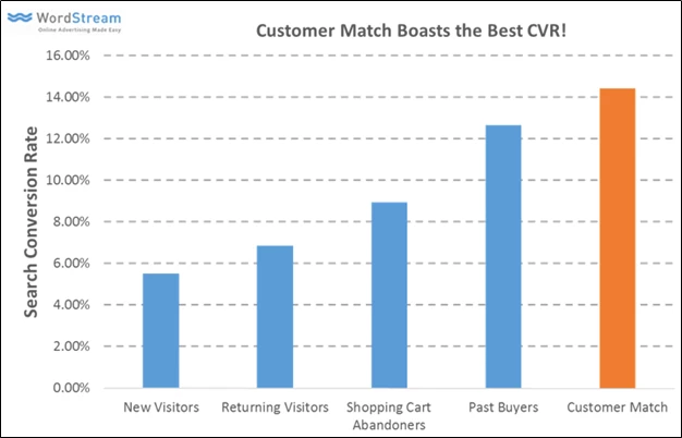 A study by Wordstream shows that Customer Match campaigns have the highest conversion rates compared to other audience collected from website data.