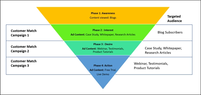 Below is an example of a B2B sales funnel, where the audience is segmented according to their actions in the buying cycle. For a segment, which has already shown interest in blogs, adverts on whitepapers, case studies and research articles could be displayed to them.