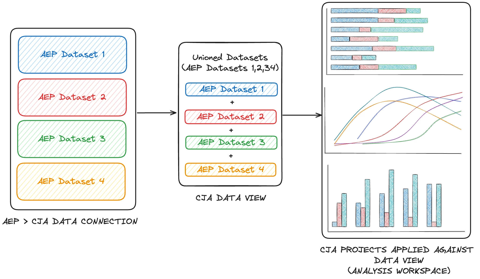 With Analysis Workspace, businesses can directly access and interact with datasets sourced from Adobe Experience Platform (AEP). These datasets are ingested and processed through a Connection and then configured into a unifying Data View. It's important to note that there can be one to many Data Views per Connection, and the current CJA Guardrails allow for up to 50 unique Data Views for a given Connection. By utilizing these three levels of integrated platform solutions, businesses can gain a comprehensive understanding of their data in Analysis Workspace. This enables them to identify trends, patterns, and valuable insights that contribute to growth and success.