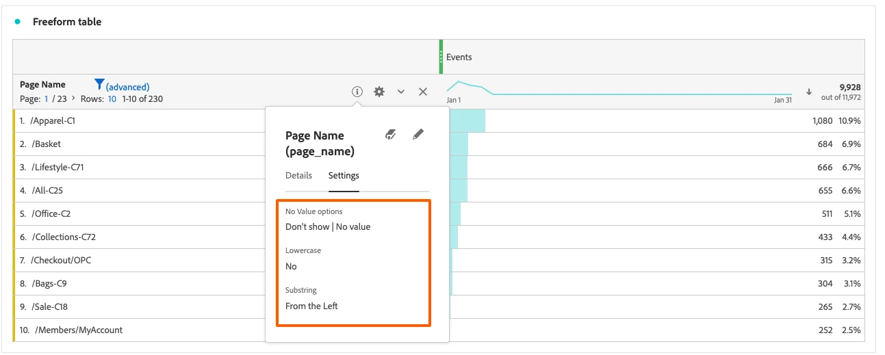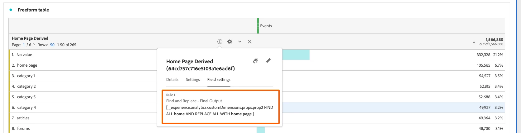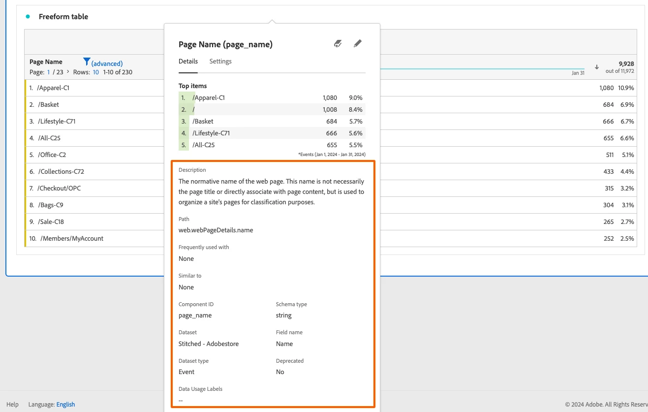 In CJA, referring to the Details section (refer to Figure 2: CJA Component Info Details Section) is often valuable for obtaining information about a specific dimension or metric. In CJA, dimensions or metrics that are directly defined are always based on a specific component schema path value configured at the Data View level. The Details section allows you to verify the lineage of the component and trace it back to the dataset it originated from. Developing the skill of checking is crucial for understanding the full breadth of data in your CJA instance, especially when dealing with the possibility of Derived Fields coexisting with base components that are directly set from datasets. Performing this action is useful because it enables you to establish a mental connection between the final form of the data in CJA and its source dataset and schema level. You can also verify the component level settings (refer to Figure 3: CJA Component Info Settings Section) applied for the component under the Settings option in the Workspace. In the case of Derived Fields, there is also an additional 'Field Settings' tab that provides the rule-based logic for deriving the component (refer to Figure 4: CJA Derived Field settings for an outline of the logic behind Derived Fields).