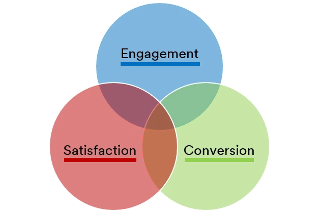 One way to think about these concepts is to consider a typical retail store environment. Imagine watching people in a store as they are shopping. There are many different behaviors that you might observe which might indicate a more or less engaged shopper. These shopping behaviors are different from them actually buying something (conversion) and from how happy they are with the shopping experience (satisfaction).