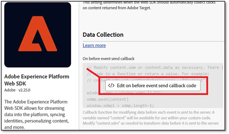 To set up this xdmp variable via the AEP Web SDK extension in Adobe Data Collection Tags, click on the "Edit on before event send callback code" link under the extension's Data Collection section (as shown here):