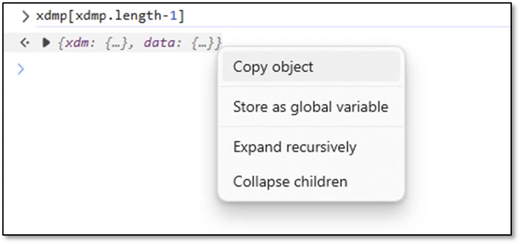 Now, if your site uses any Single-page Application-based technology or contains any pages where the DOM doesn't need to reload between your tracked actions, the xdmp array could continually increase in size and become increasingly difficult to parse through. In such cases - and at other times - you would probably need to examine the contents of only the most-recent payload. To do so, type xdmp[xdmp.length – 1] into the console rather than just xdmp. The console will then provide just the contents of the most recent payload instead of the whole entire list of payloads. You can then right-click on the result to begin the same examination process as described earlier (i.e., "Copy object" then paste into your text editor).