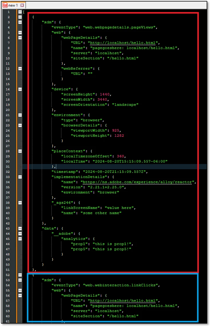 In the gifs above, you'll notice the xdmp array contained three objects, each containing payloads that were sent out via three separate sendEvent calls. The following screenshot contains the complete contents of the first payload and the beginning of the contents of the second payload.
