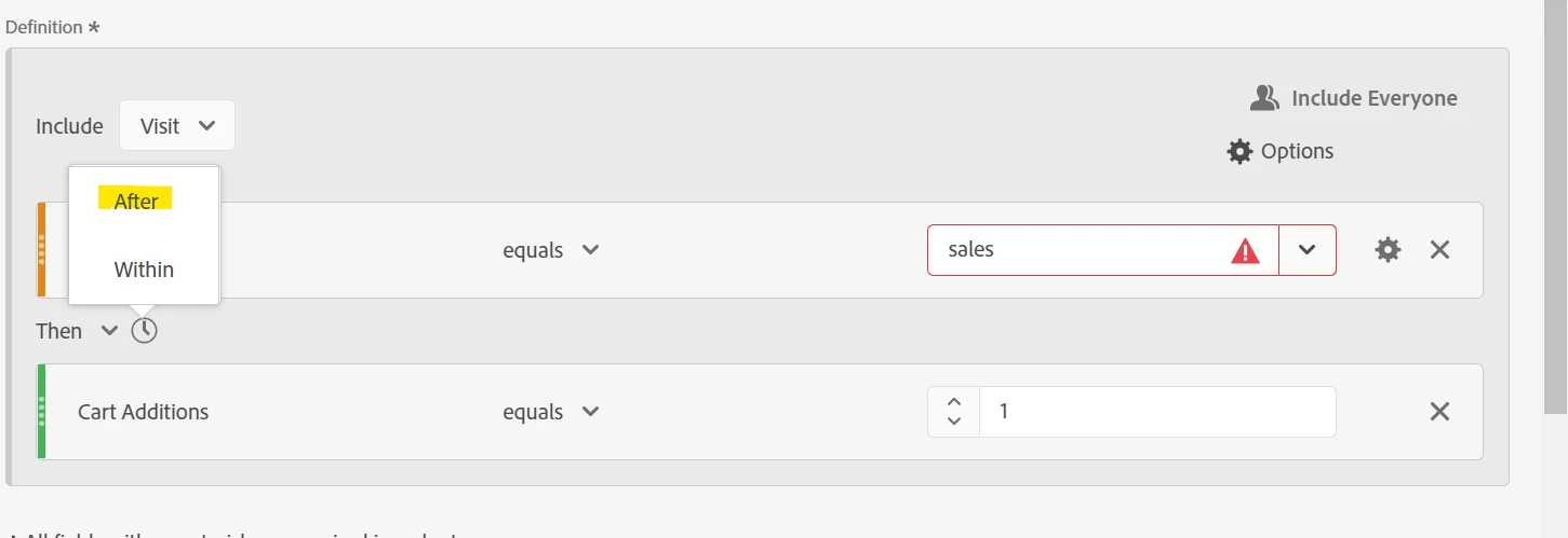 Description - In the Sequential Segment option (https://experienceleague.adobe.com/docs/analytics/components/segmentation/segmentation-workflow/seg-...) there is the ability to have the segment include data that happened before or happened after.  Could another option be added to only include data from hits that happen DURING the sequence.  For example, if we wanted to see a "add item to cart" event that happens after someone clicks on the "sale" custom link, we could set the sequence and say "after sequence" and it would capture the "add item" event from clicking on the link but then include all "add item to cart" events after that sequence as well.   If we wanted to see only the item that was added after that custom link click, we would not be able to.