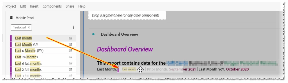 I would like the ability to drag certain components (date ranges, eVars, segments, etc.) into my Text field and choose to display the title or value represented within that component.
