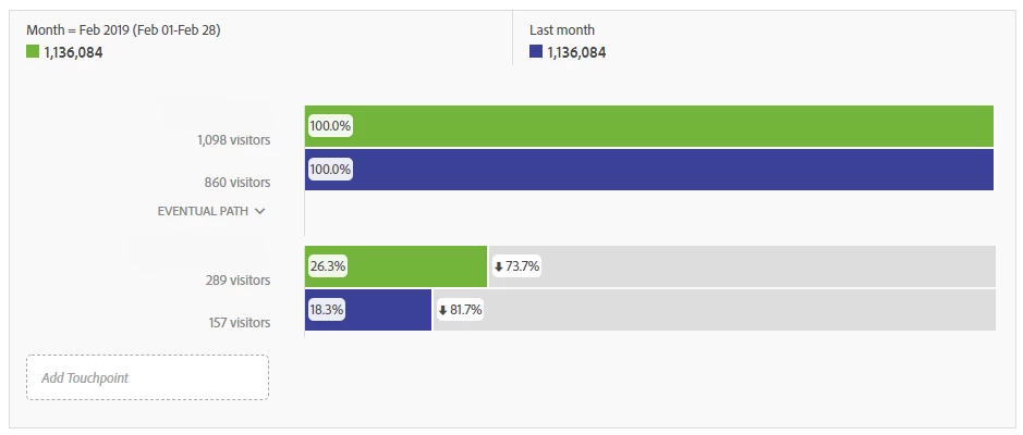 So then I've broken down the funnel itself, one using the Month dimension and choosing February (in green below) and one using the time period 'Last month' (in blue). Last month being February, of course. So, my question is... why are the two values different? Is there a difference in the way these are processed that could have an impact?