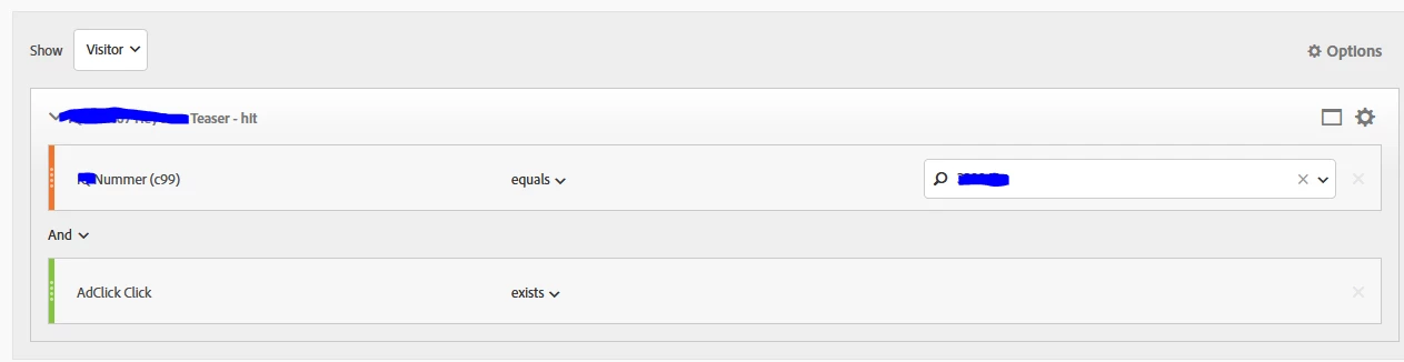 i have a short question and i hope that you can help me: There is a metric that is called "AdClick Click". In my opinion, it is a measure to measure who clicked on an any ad. How do I set "AdClick" to run only from a specific campaign and not all AdClicks as a whole? Is the way you can see on the screenshot the correct way? If yes, why? Because i think it measures only visitors, who are a part of that Dimension (Nummer (c99) AND clicked on any ad but not that speicif ad for this campagne. Or is this the result because of the "and clause"? If not, what do i have to configure?
