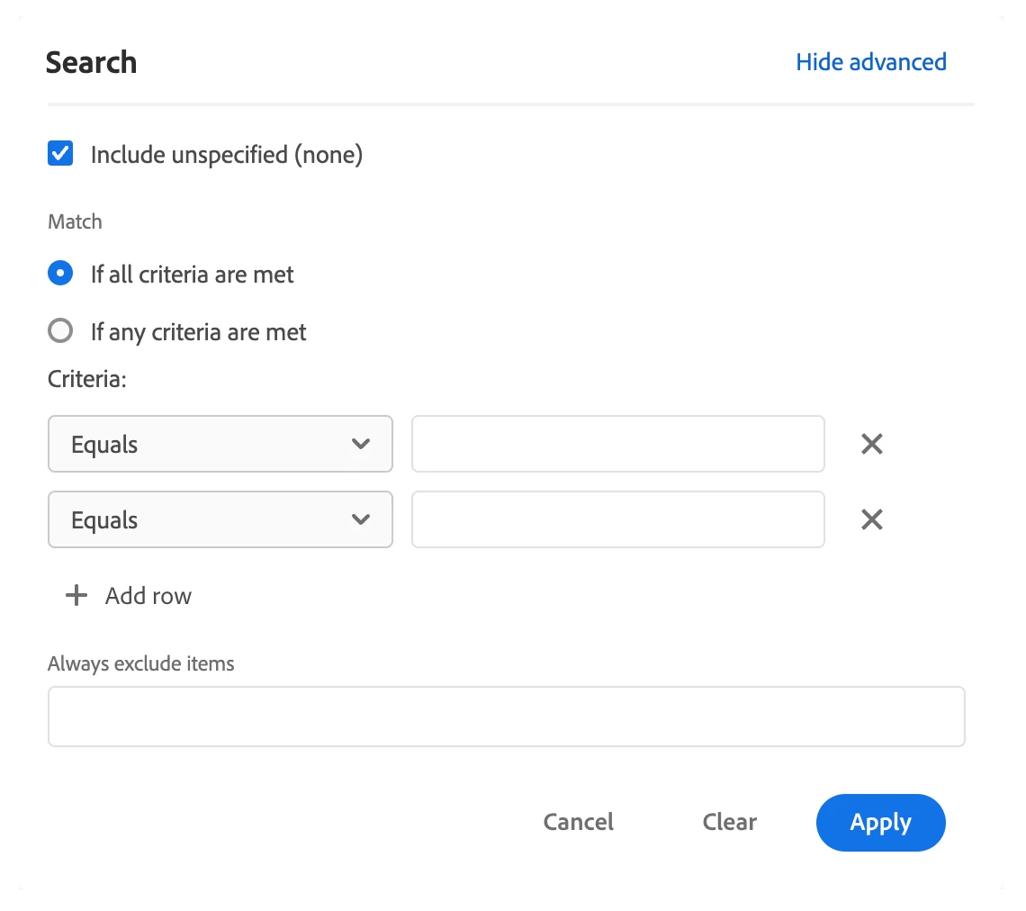 Description - When opening the advanced filter in a freeform table in workspace, it would be very useful to have an option to "equals any of" like in segment builder, as opposed to having to add separate criteria for each unique row you are trying to keep.