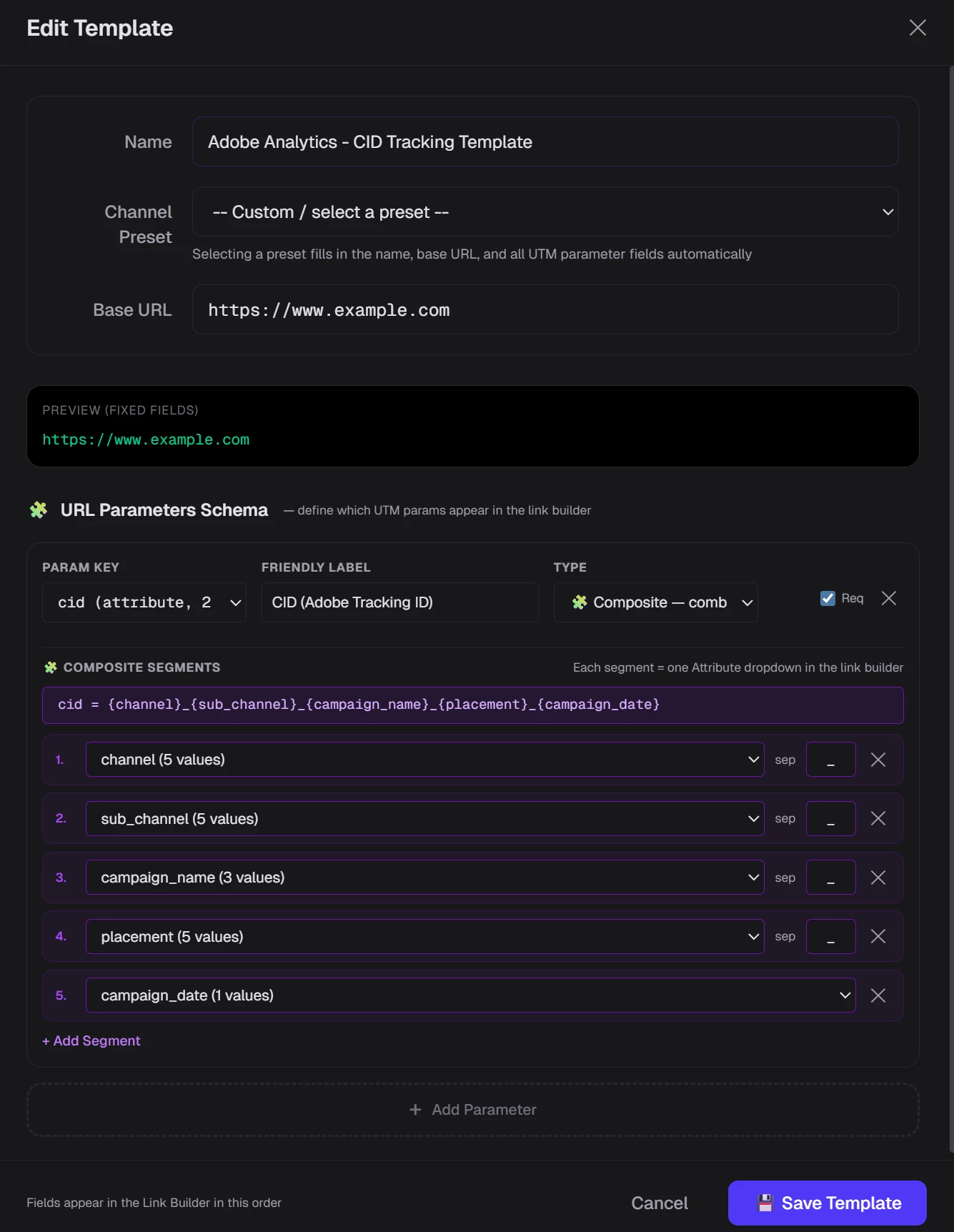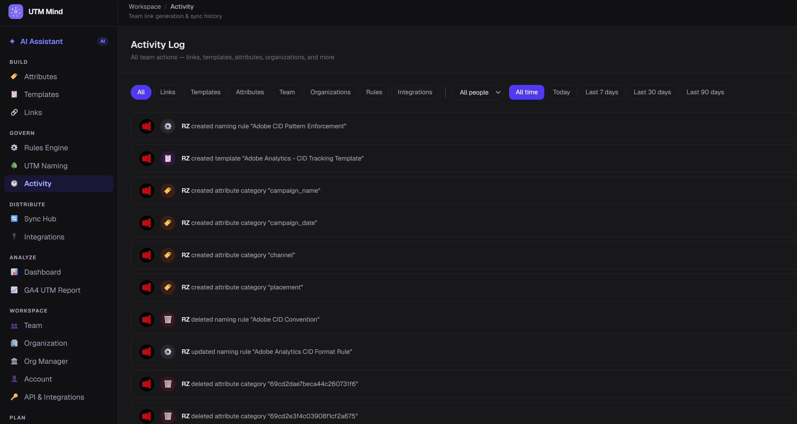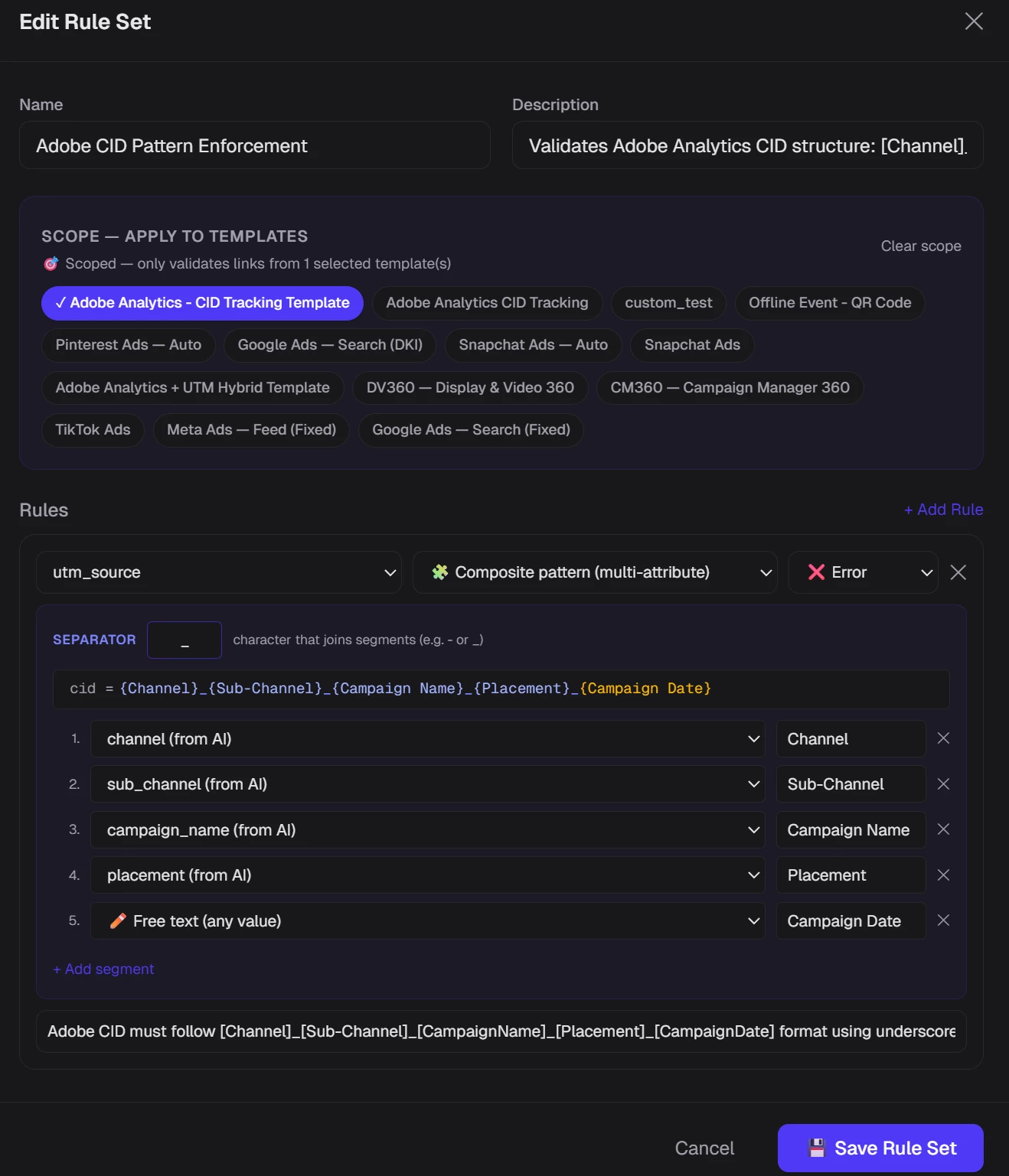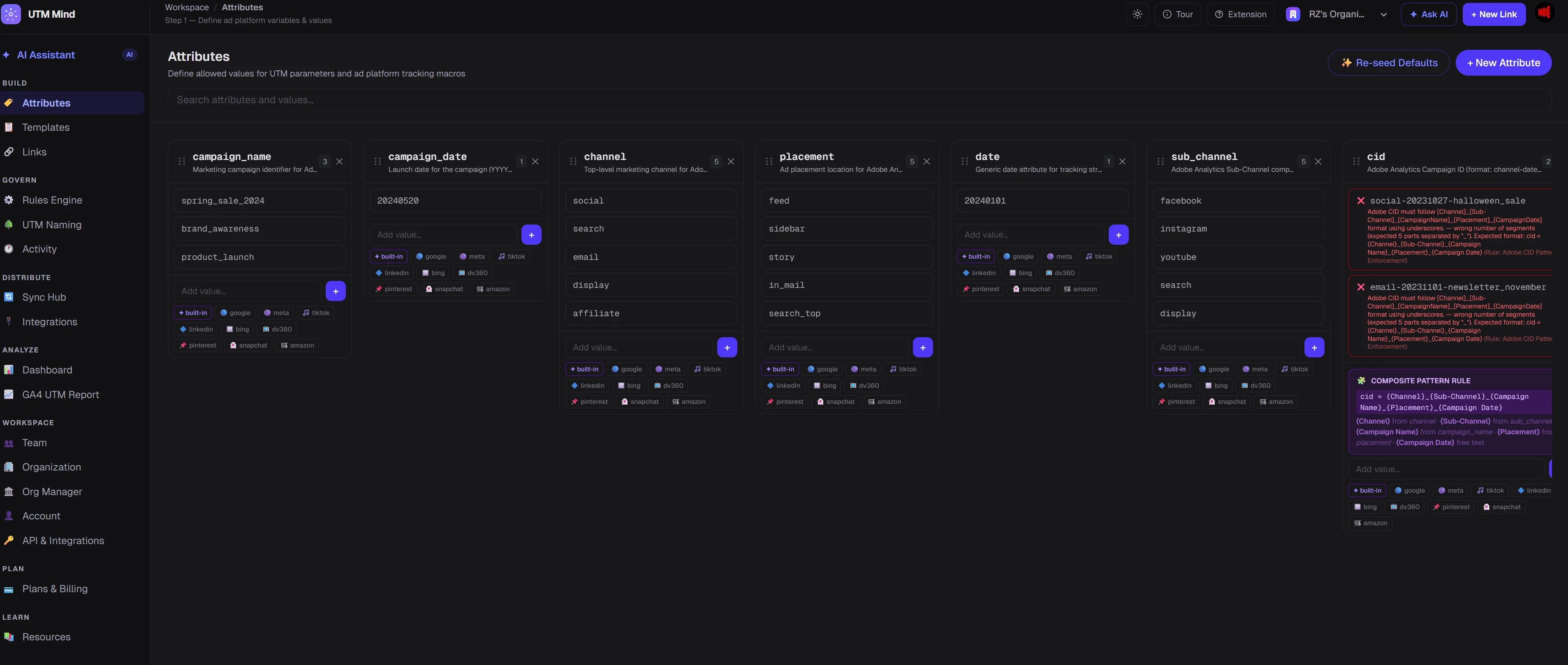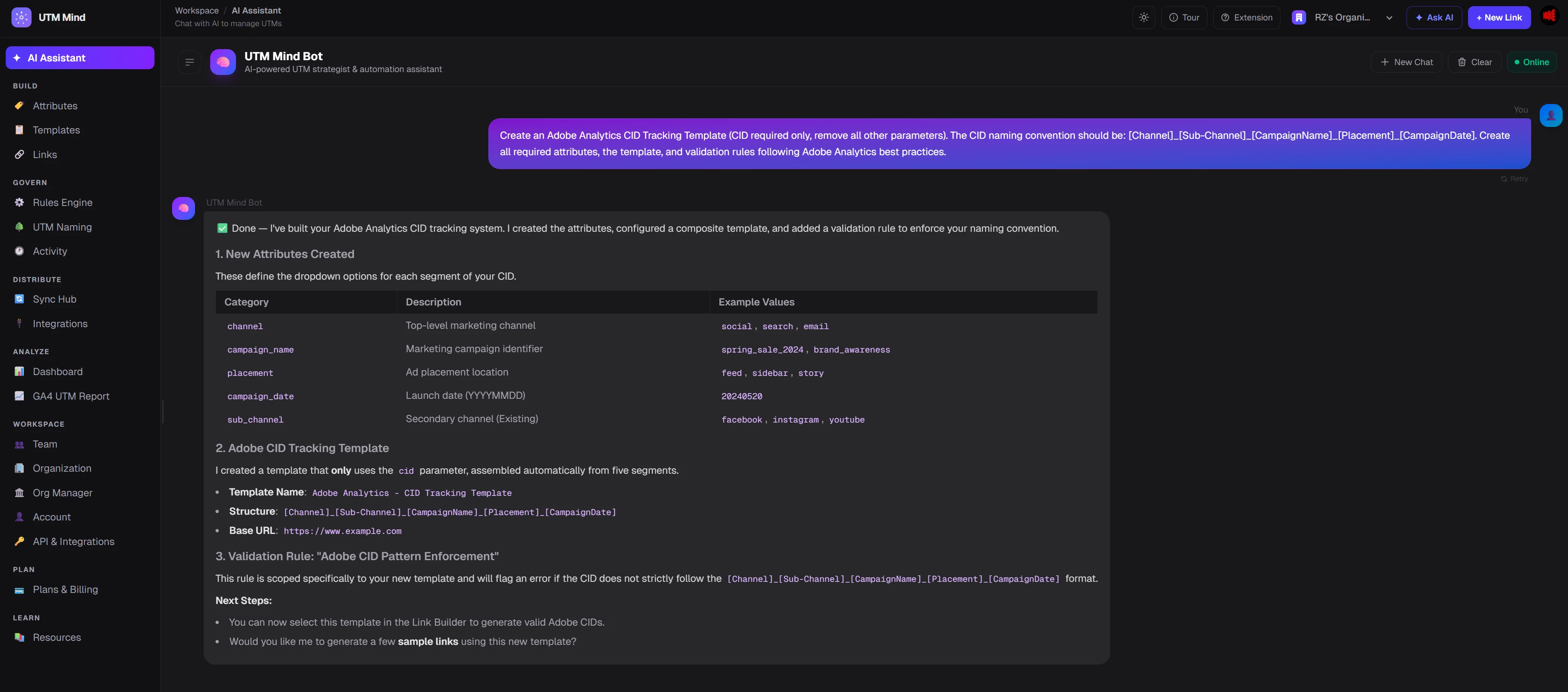 Instant Architecture: The UTMMind Agent automatically creates the individual attributes (Channel, Sub-Channel, etc.) and binds them into a unified CID template.