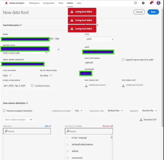 Adobe Analytics Data Feed "Saving feed failed"