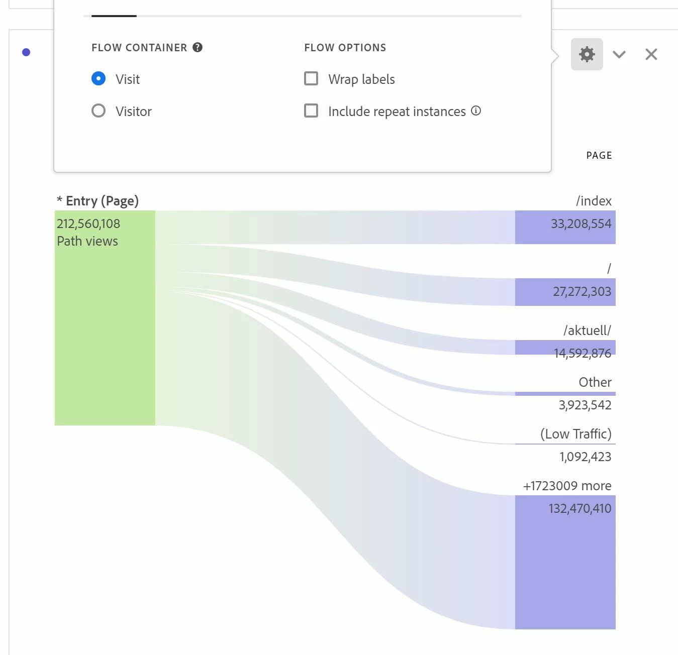 1. What does the number of Path Views saying? In which way it is depending on the Flow Container? Because what irritates me, is the description of the Flow Cointainer. Becaues if i select "visit" the container description says, that the flow show me the number of visits. So does this mean, that "/index" was the Entry Page in 33,208,554 Visits or what does Path View in this case mean?