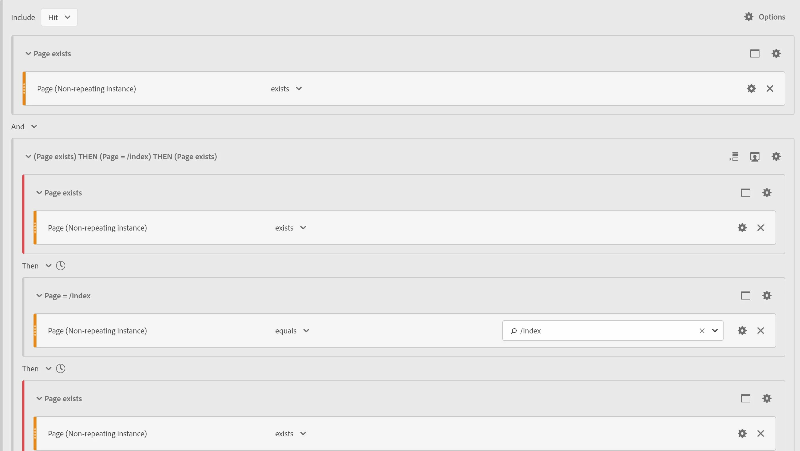 2. Now we take a look at the segment of this Flow Segment for the Entry Page "/index", which Adobe Analytics is building. Unfortunately, I don't understand the structure of the segment. Why there is an AND condition between these two containers or why it has to start with the first container "Page exists" and then the second container starts with excluding "Page exists"... If i had to build the segment myself, i would just use the second container but the first container with "Page exists" seems to be necessary. Do you know why?