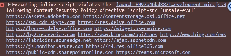 We are working with a SharePoint website and have encountered an issue where Adobe Analytics scripts are being blocked by the Content Security Policy (CSP). Although we have already whitelisted the Adobe script, the browser console still shows an error indicating a CSP violation.