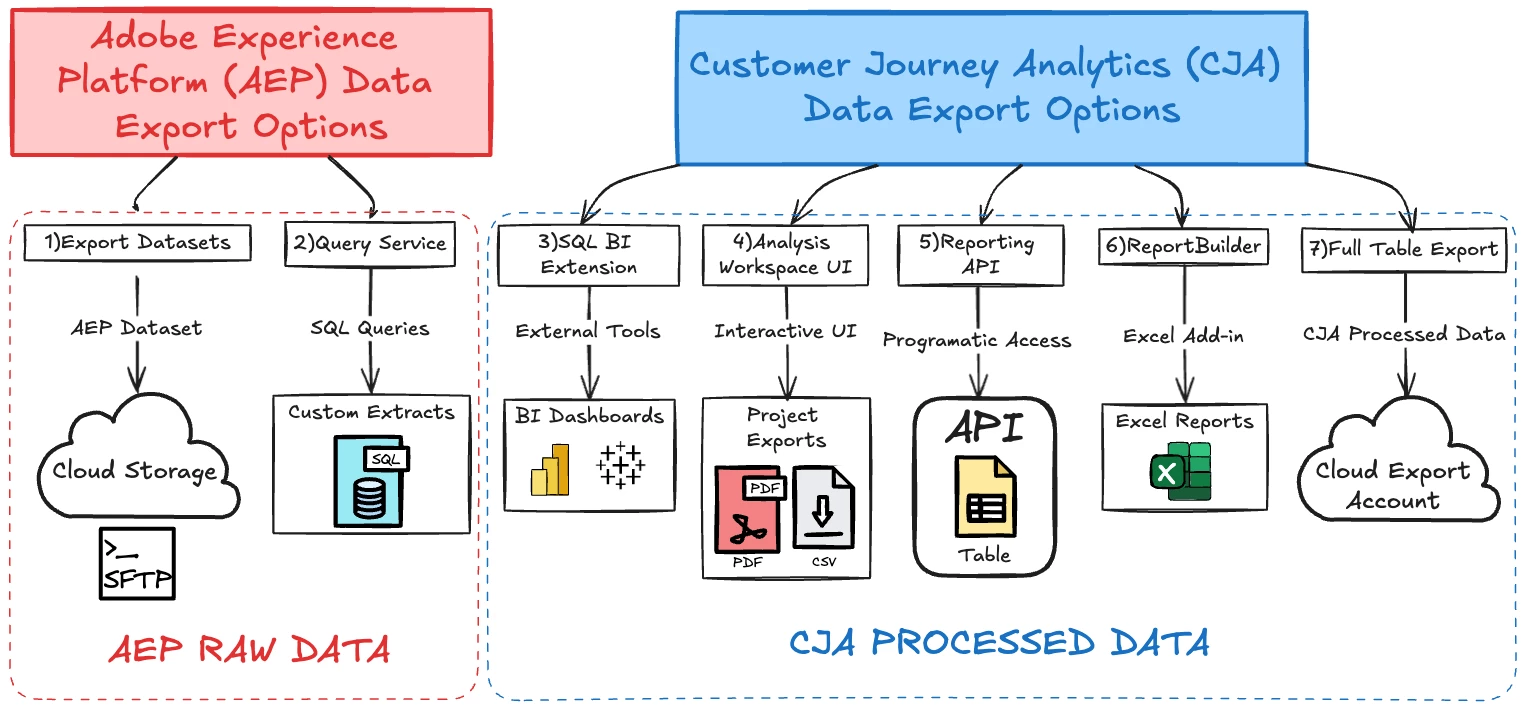 This blog post explores the data egress cases offered by Adobe Experience Platform (AEP) and Customer Journey Analytics (CJA). We'll examine each option's diverse functionalities, providing you with a clear understanding of their capabilities. We'll also analyze the strengths and potential limitations of each method, empowering you to make informed decisions when selecting the most suitable egress option for your specific needs and requirements.