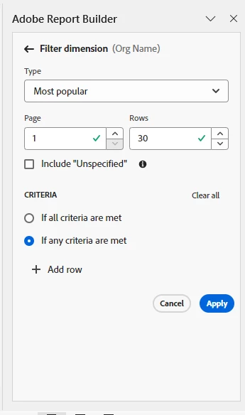 If you don't care about the order, you it will default to Most Popular... you can change this from 10 to a higher number... but you cannot pull "unlimited"... if you need to pull everything Report Builder is not the correct tool for the job.