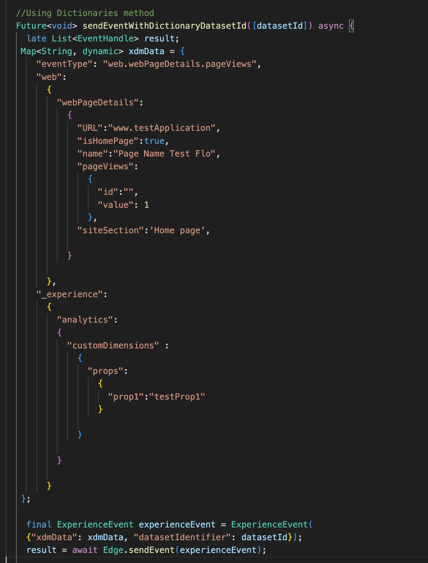 Map<String, dynamic> xdmData = {“eventType”: “SampleEventType”};