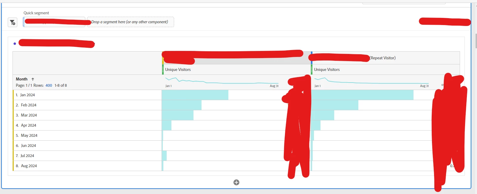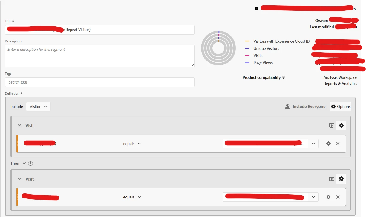However, some sample attempts that I have tried don't seem to be working... as I should end up with "1" on PV/UV for my specific page, and I am not. I have noticed that Visitor Segments seem to be acting a little odd lately... not returning data in an expected fashion - particularly when using excludes.... I suspect some logic was changed and something is broken.. but I haven't had a chance to investigate it...