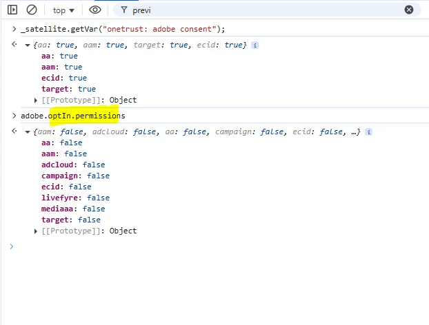 However, these values are not being passed to adobe as "true" for some reason and when i look for adobe.OptIn.permissions on the console, it is returning the below result.