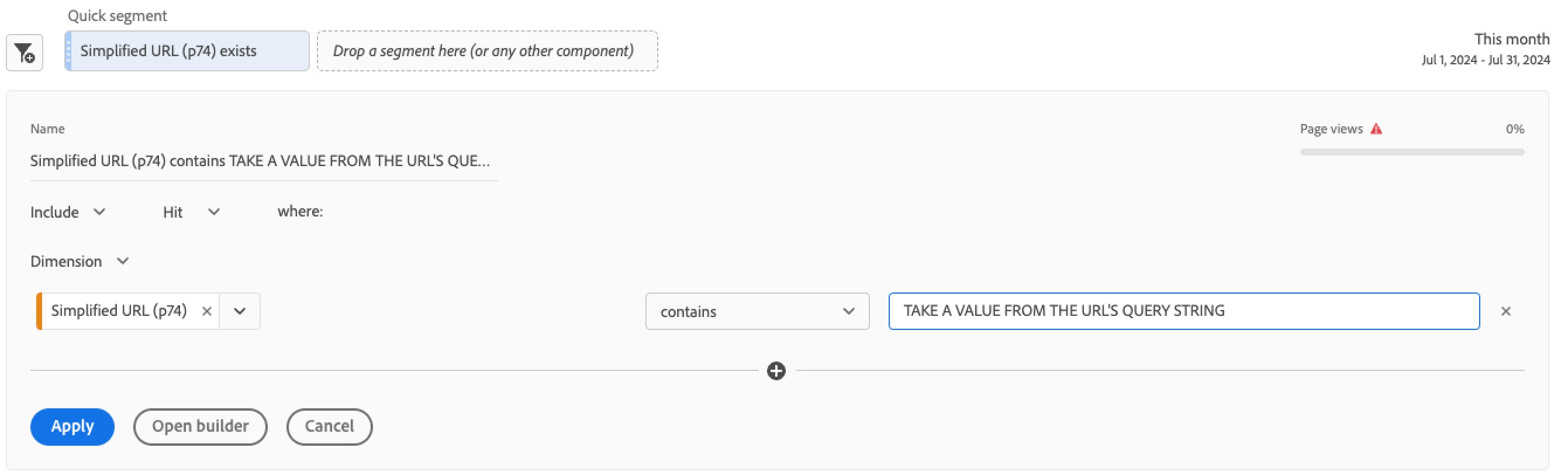 I want to create a web hook from a given page to an Adobe Analytics dashboard triggered from a browser's Console entry. Basically, an entry that would be something like 'See this web page's traffic volumes here: https://experience.adobe.com/#/@mycompany/so:somecode/analytics/spa/#/workspace/edit/aaaaaaabbbbbbbbbcccccc?PAGE_URL=www.mysite.com/some/page' We would define a dashboard with a Segment of a dimension 'page url'. I would need that segment to - instead of having a statically defined value - read the value from the PAGE_URL query string. The dimensions and metrics would prefill based on the segments filter value, making it evergreen for any page that a user loads it from. The segment filter currently only accepts static values and what i'm asking for seems pretty unique.