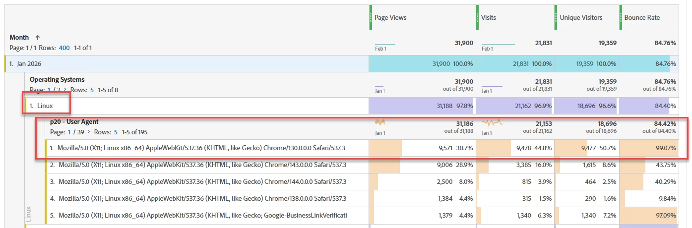 I made a report in Workspace and noticed hits from Linux. I broke it down by User Agent and most of the traffic were from Mozilla/5.0 (X11; Linux x86_64) AppleWebKit/537.36 (KHTML, like Gecko) Chrome/130.0.0.0 Safari/537.3. It’s also interesting that the Bounce Rate from these visits are very high, 99%. Are these from bots? If so, is the best way to handle it by making a Processing Rule (in Admin)?
