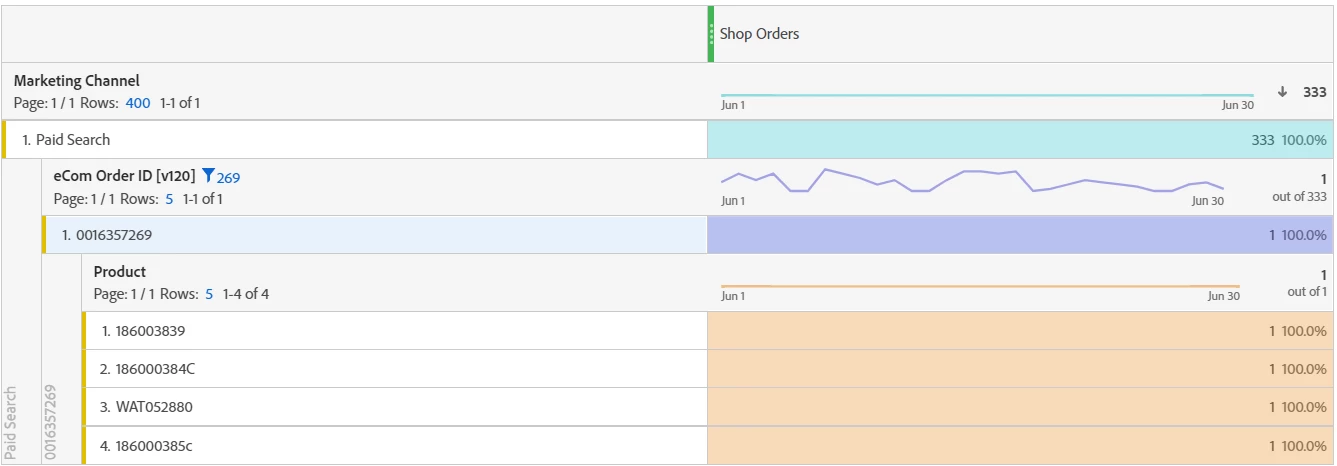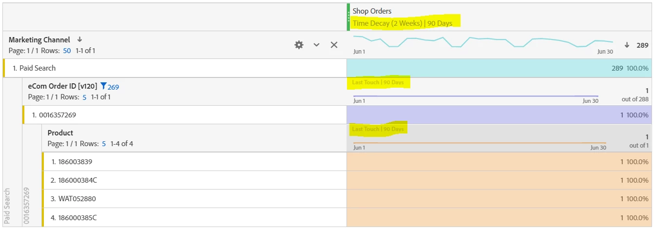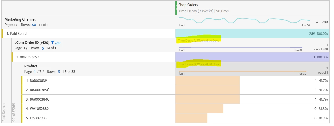 Screenshot2: with same attribution model across dimensions(breakdown) [5th product is not part of the order]