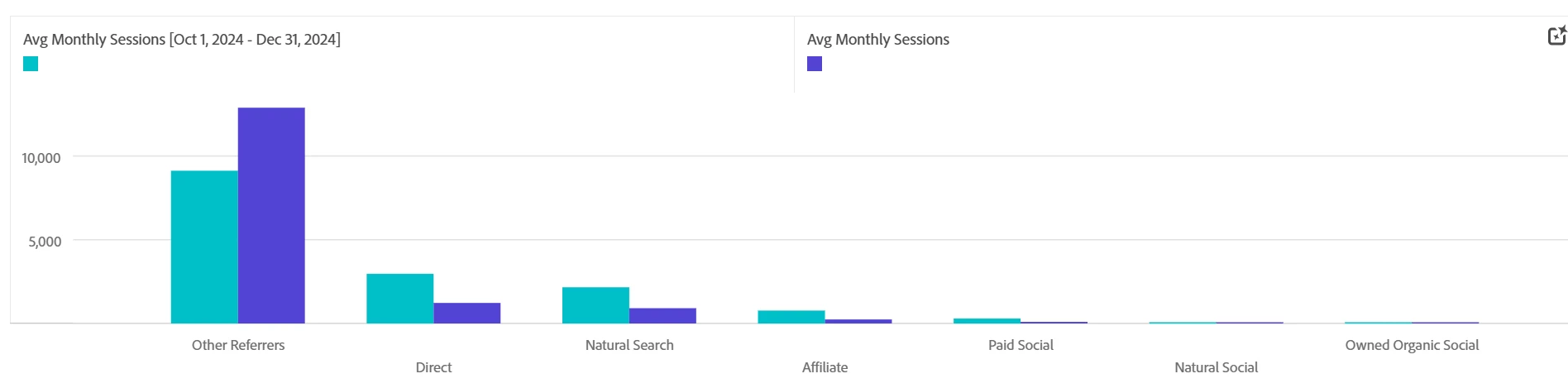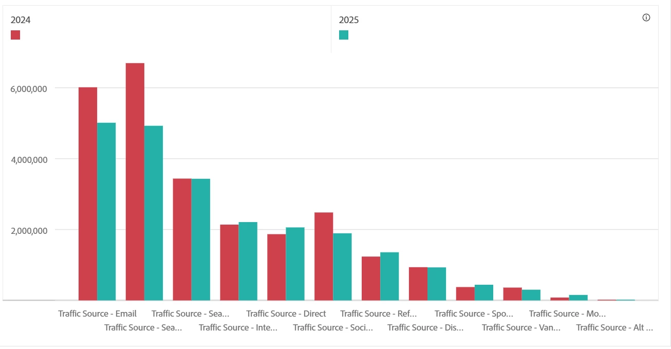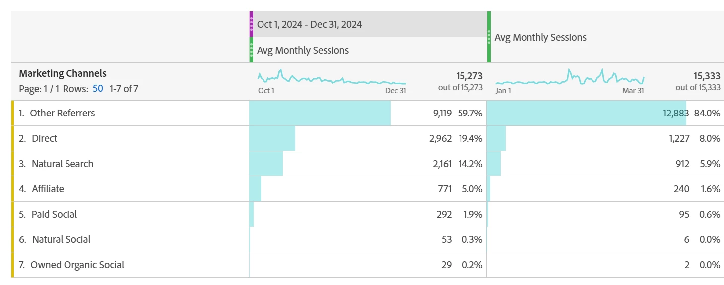 This is a follow up to a previous post that I made re: average monthly unique visitors. I used Josh Stephens solution of the Column mean function to find average monthly unique visitors using the Month dimension. However, I have been asked to compare average monthly unique visitors by channel with a YoY comparison while putting it in a graph (that will hopefully look like the below screenshot). I am having issues with this because it is difficult to have the month dimension in a table that compares the three months of Q1 of 2024 and Q1 of 2025 with the different channels and calculating a mean for all of those functions in a neat and understandable way. I hope this makes sense!