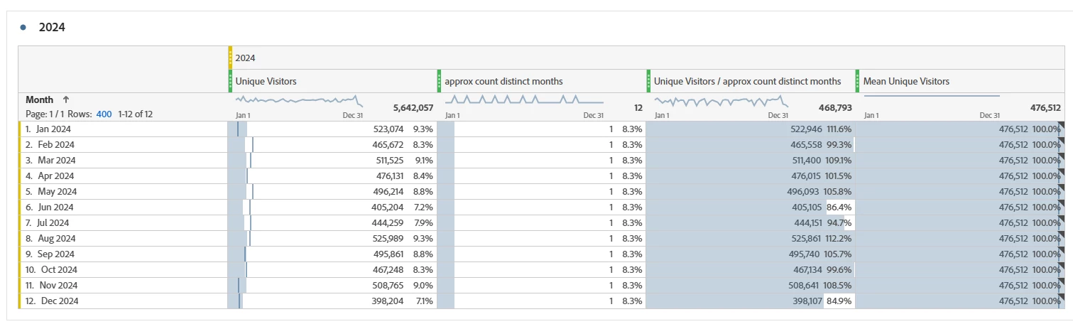 1. Average Monthly Unique Visitors (which I think I created correctly: UV / Approximate Distinct Count (Months)) for 2023, 2024, & Current YTD 2025