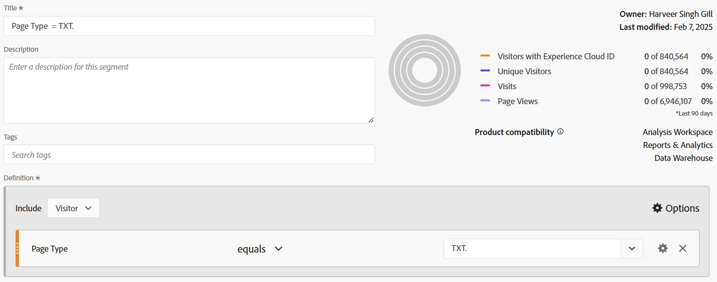 Please note that above segment will return all the page view across all pages from the visitors who have viewed page type "TXT.". So the calculation in metric give you average page views across all pages from these visitors. If you only want to calculate average page views for pages under page type "TXT." then you can change the segment container from visitor to hit and it should give you the desired data.