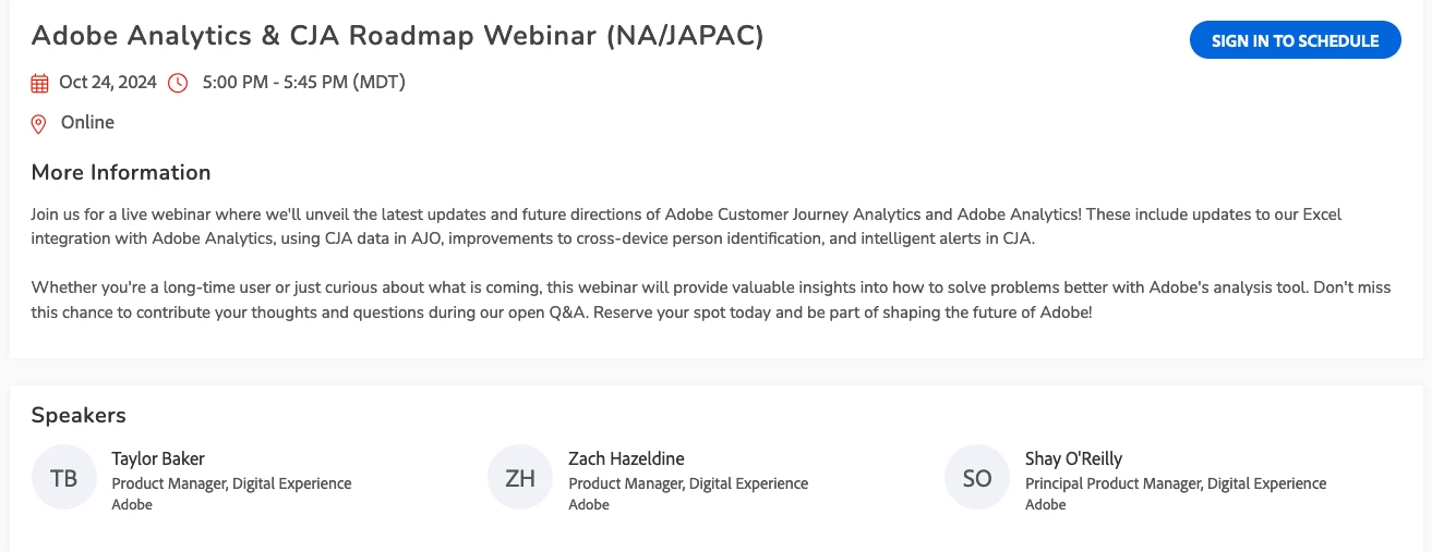 Roadmap Webinar for Adobe Analytics & Customer Journey Analytics is on October 24th 11AM EDT (NA/EMEA) and 7PM EDT (NA/ANZ/JAPAC). This live 45 minutes webinar will unveil the latest updates and future directions of Adobe Analytics with it's focus on Customer Journey Analytics. In this roadmap webinar, you will get to take a look at what’s coming next. Also, have an opportunity to ask questions and engage directly with the Adobe product team.