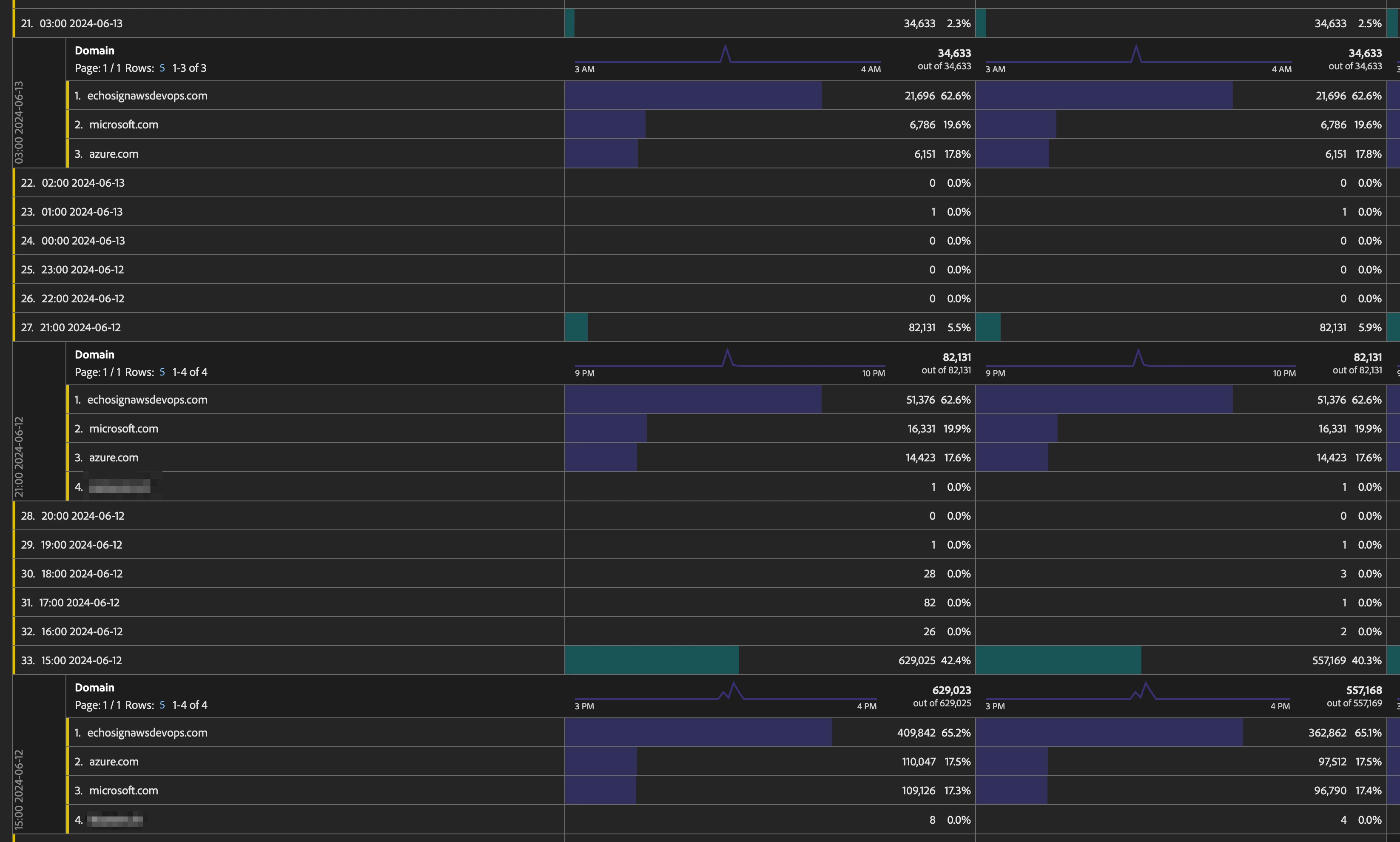 could narrow the traffic down by breaking it down by domain. It is a pattern that happens every 6h, with the same domains involved to almost exactly the same percentage
