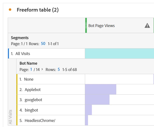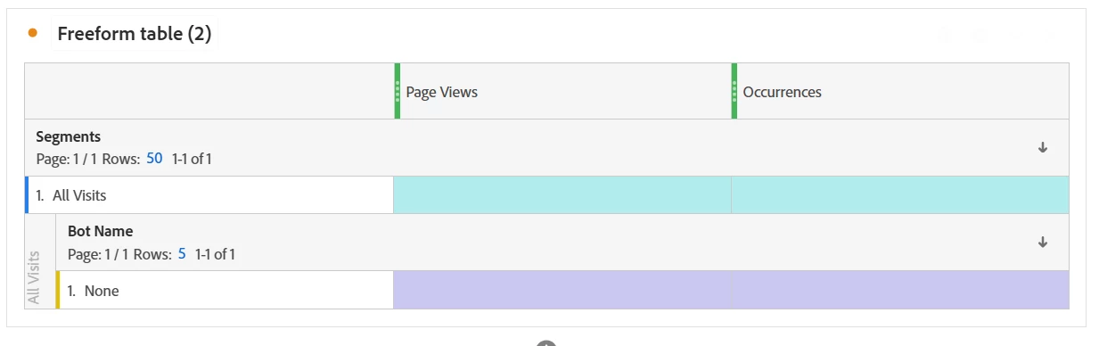 The Bot Name dimension is an Adobe provided component. Using the Bot Name dimension, you will see the names of the bots detected or custom bot rules supplied. Bot Name should only be used with Bot Page Views and Bot Occurrences. If this dimensions is used with any other Analytics metric, no data will result because it is unassociated with normal customer-based data in Analytics. Data processing for Bot Page Views began between February 26 and March 10, 2023; as a result, any reporting window prior to this date will not have data. The Bot Page Views metric shows the number of times a bot was set or persisted on a page. The Bot Page Views metric should only be used with the Bot Name, Page, or standard time dimensions, such as Day or Week. Bot Occurrences shows the number of hits where a bot traffic was detected. Similar to the Bot Page Views metric, the Bot Occurrences metric should only be used with the Bot Name, Page, or standard time dimensions.