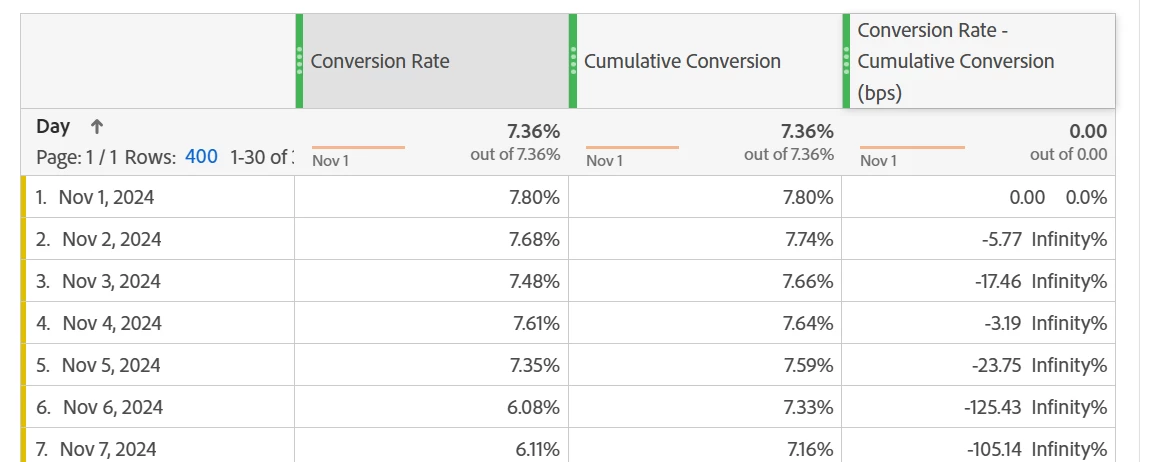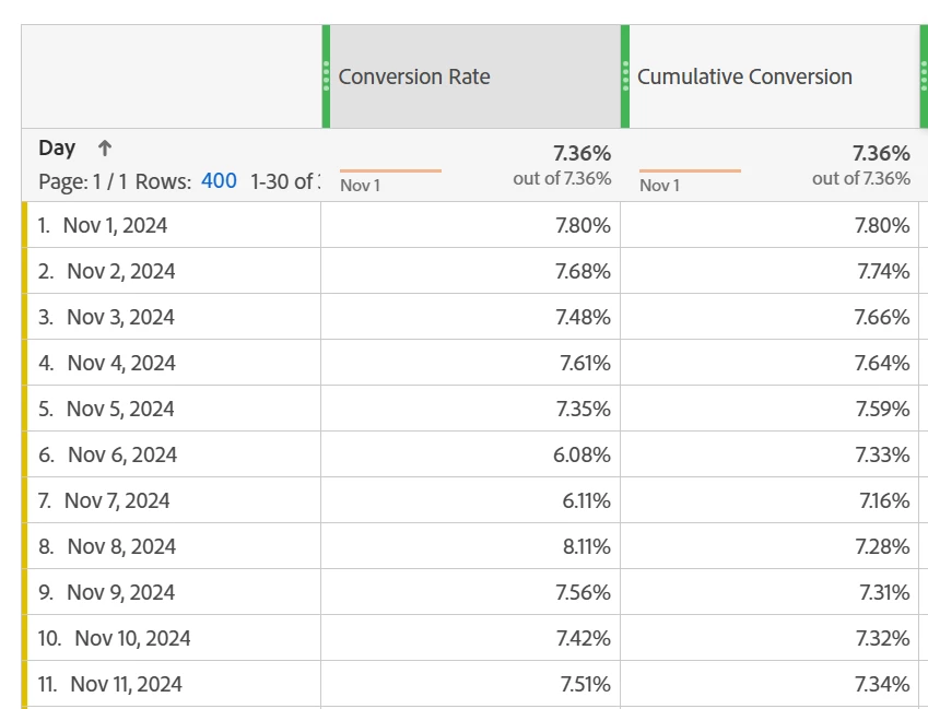 Then you need to put that metric in your table against the day dimension. This will calculate a cumulative average. I just did November for my example. But Nov 1 the average is equal to the conversion because it's only one day. But Nov 2, is the average of the first two days, Nov 3 is the average of the first 3, and so on. You do need to have the day dimension in the table for this to work, so it can calculate the average based on the days.