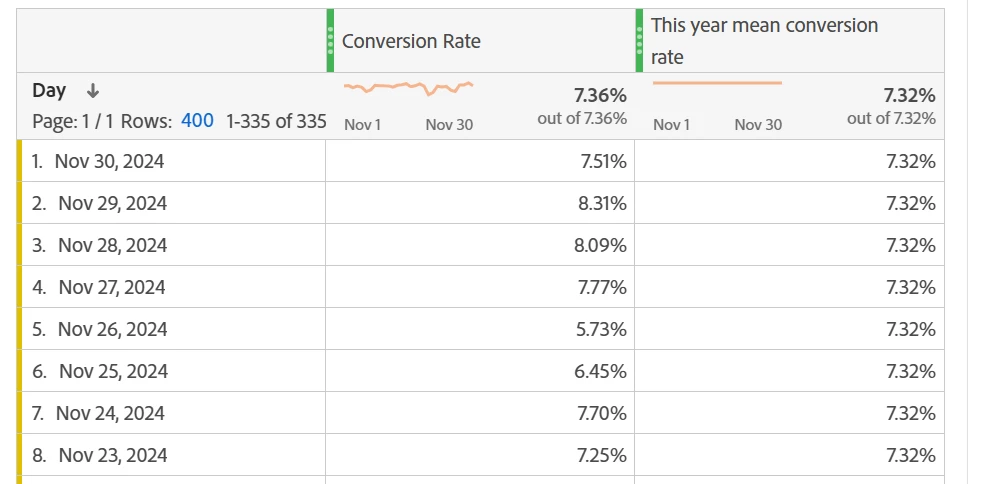 You then put that metric in your table and instead of calculating a different average for each day as time goes on, it will calculate the average for the YTD total. You can put it against something like "all visits" and use a second column with yesterday's conversion rate to compare just the last day. Or, you can use the date dimension and look at each date compared to the average. The only callout with that is that the average is going to be for the whole YTD, not from the start of the year up to that specific date.