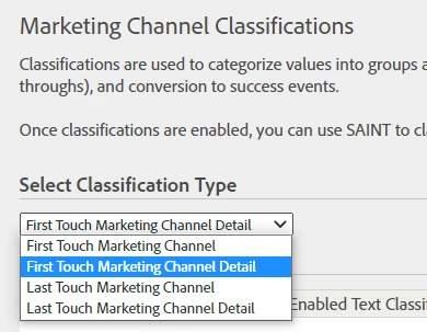 The Marketing Channel Classifications also allow you to classify both First and Last Touch, and the Channel / Detail.