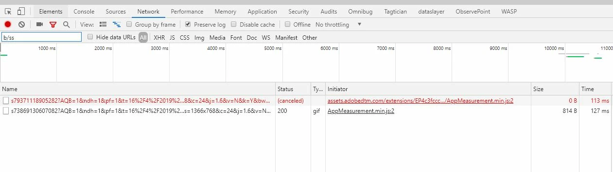 When I check under the Console->Network tab, it shows the image request is getting cancelled followed by a subsequent image request firing. Although the beacon is firing, the data is not getting mapped to the eVar or the prop or the events. This in turn is resulting in report data showing up empty. Please do help!