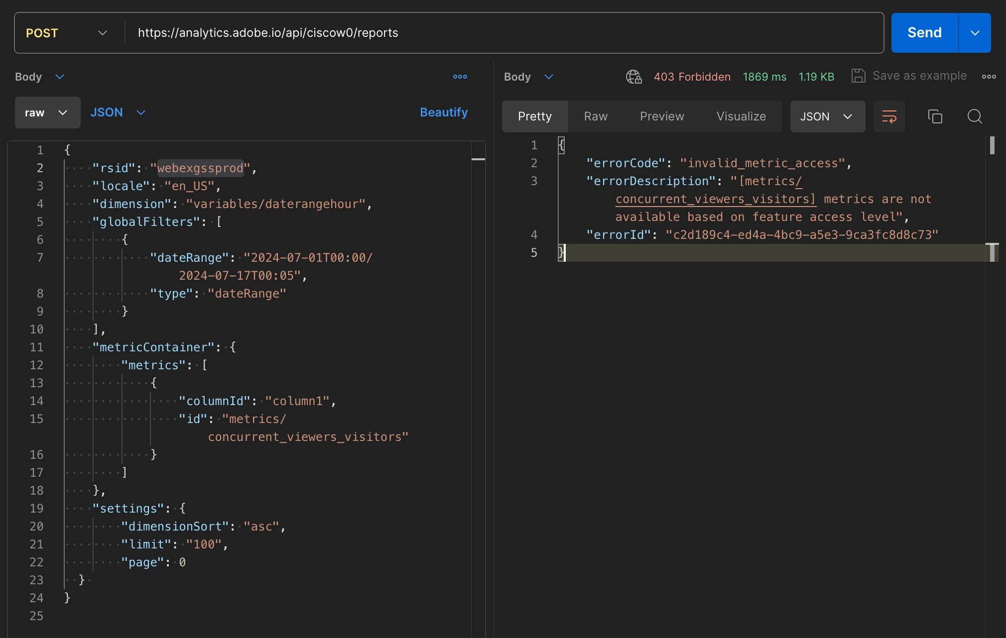 When I use Adobe Analytics API 2.0 to get a report data, the API reports an error: