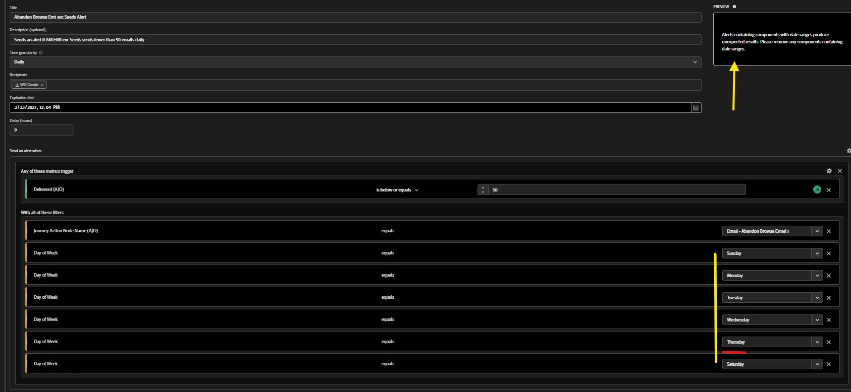 I built the below alert, which looks at the Abandon Browse email 1 exc seeds template (again this sends every day other than Fri), and checks if it’s delivering <= 50 each of those days.