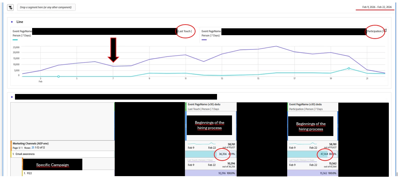 I'm comparing two attribution models in a CJA workshop. I'm surprised to see that when I compare a last touch model versus an engagement model (both with 7-day attribution windows per person), when viewing the data in a graph, the engagement attribution model's trend returns data from 7 days prior to the range I'm analyzing, while in the last touch model, the data starts counting from the beginning of the analyzed time range.