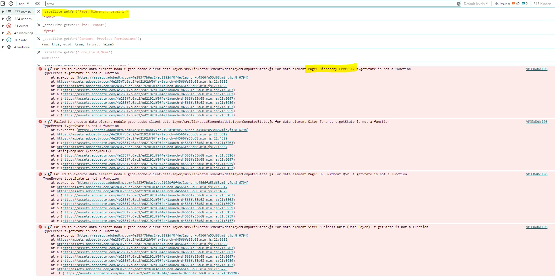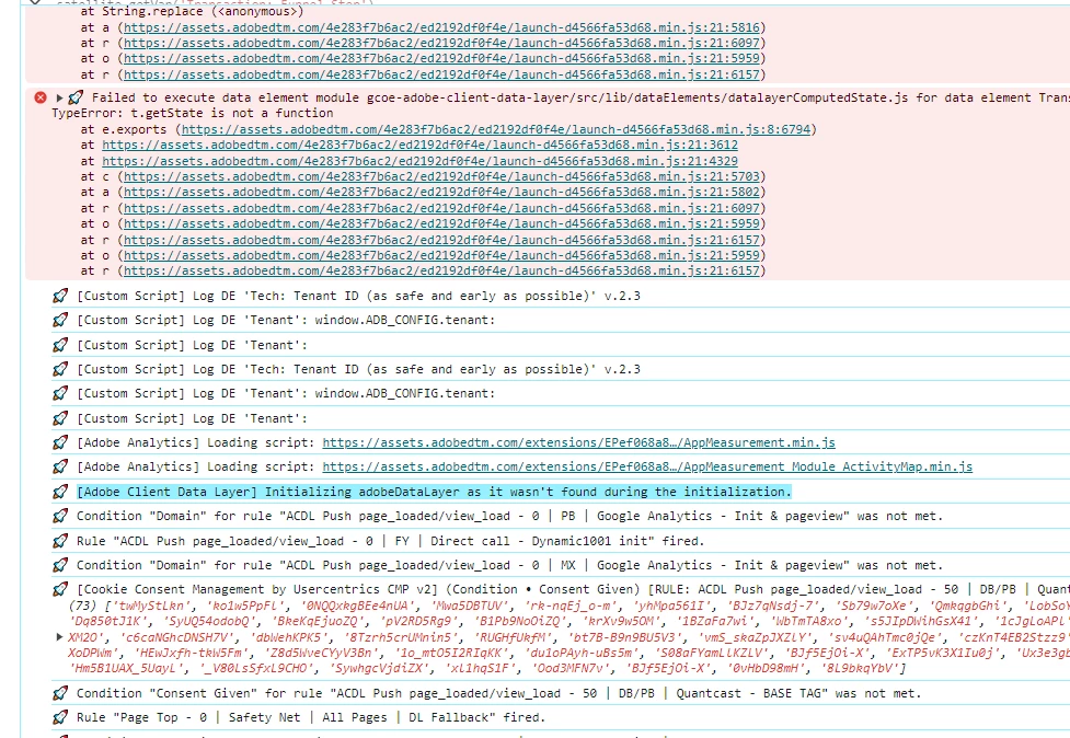 Failed to execute data element module gcoe-adobe-client-data-layer/src/lib/dataElements/datalayerComputedState.js for data element Page: Hierarchy Level 1. t.getState is not a function