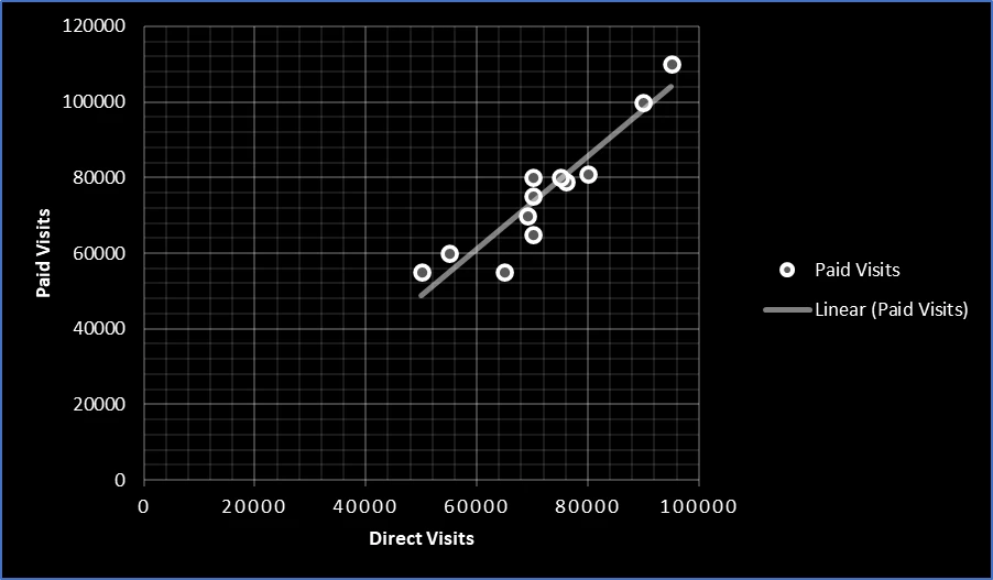 In the example above, I’ve combined the return visits from all paid channels such as Social Media and Paid Search, and correlated it with Direct Traffic. The correlation value was very strong.
