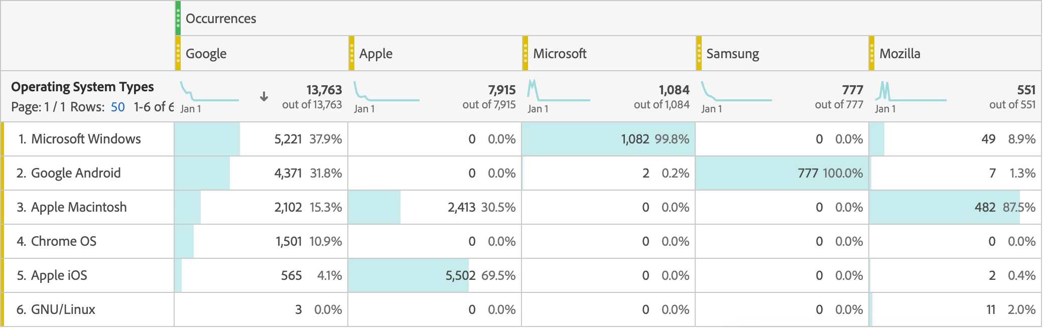 For Example - Let's say I've got an online department store and I have a project in Adobe that shows the number of items sold for each section of the site in a day (ex. Clothing, Appliances, Shoes). My project would theoretically look like ( "-" stands for change in columns):
