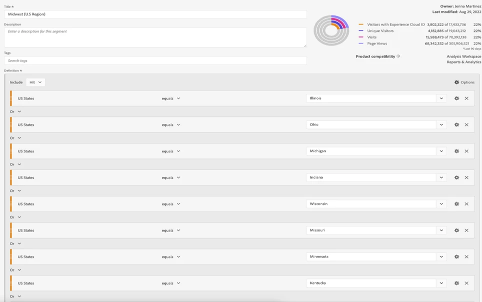 - Drag and drop each state that belongs to the respective region. Use the “OR” operator to include all appropriate states in the segment. You can also add a comma-delimited list of states by setting the segment logic to “equals any of.”