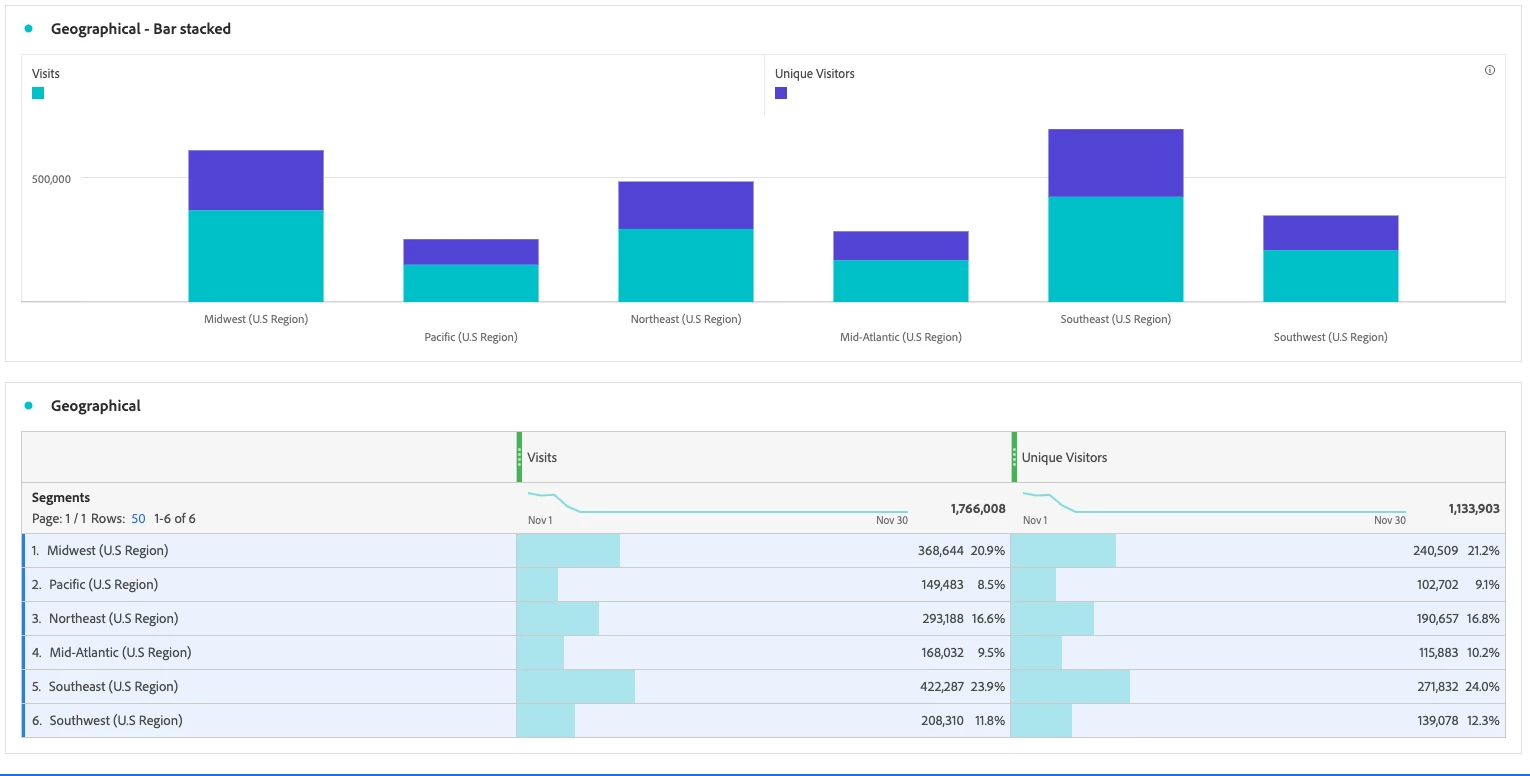 - Drag and drop the regional segments into a Freeform Table and add whichever metrics you’re looking to measure. In this example, we will use “Visits” and “Unique Visitors” as metrics, as shown below: