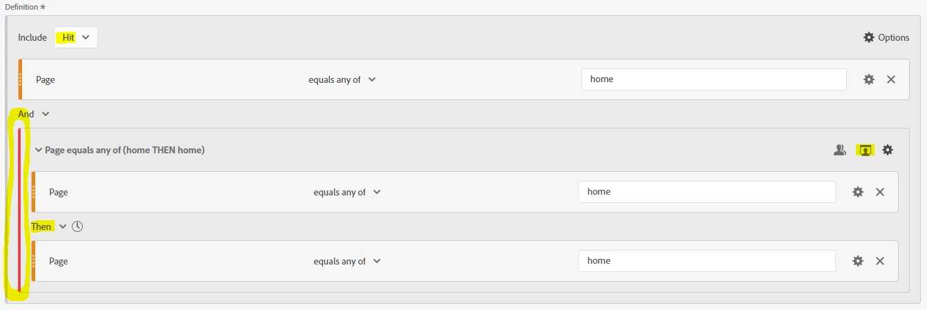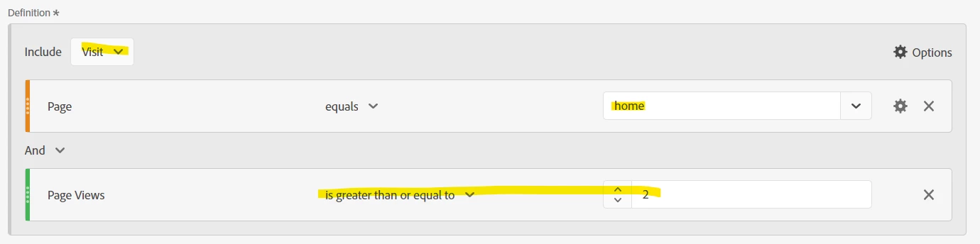 1) The number of visit of the page in my segment has to be equals to the total number of visit in my segment (in red). So I'm sure all my visit contains this page.