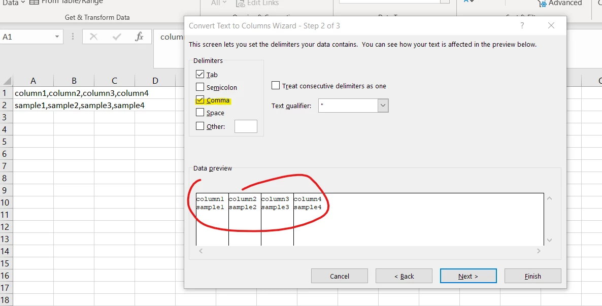When I add "comma" as delimiter, the data preview now shows correctly: