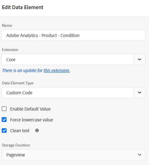 I try to retrieve the value of the "condition" variable of my products in a data element "Adobe Analytics - Product - Condition".