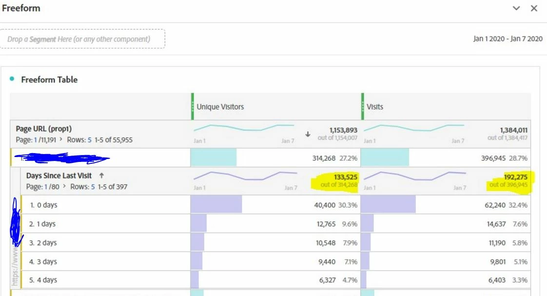 When you use the Days Since Last VIsit dimension, the options don't add up to the original unique visitor # (or visit #). For example, if you take the visits column, there were 397K visits to the page, but there are only 192K associated with the DSLV dimension.