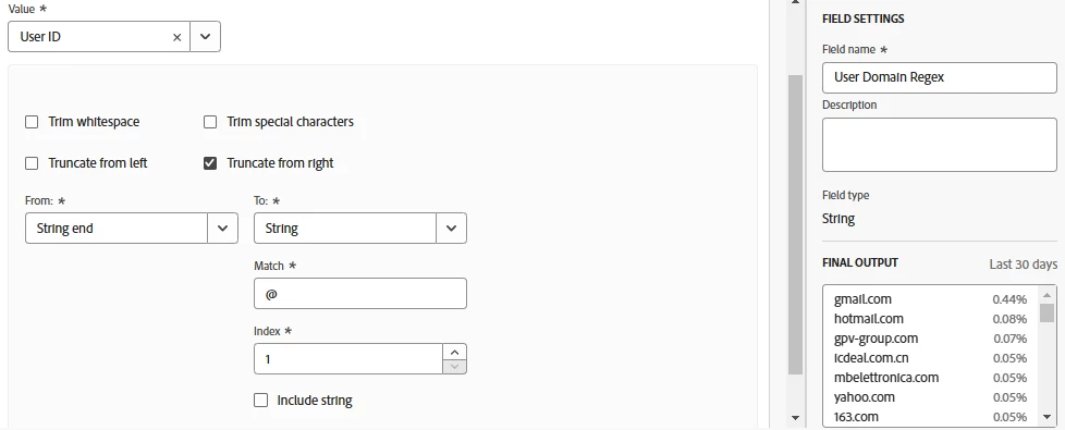 I set up a Derived Field to only extract the domain names from User ID. I used the following configuration to set up the field: